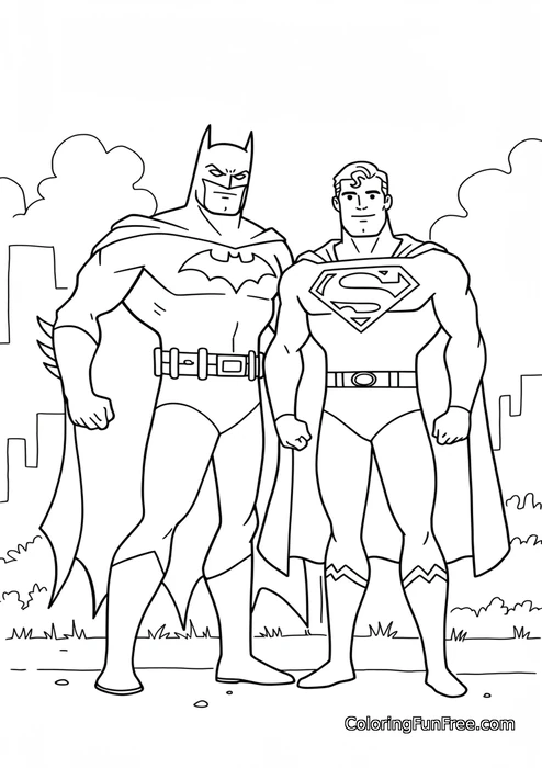 Use dark gray and black for Batman's suit and cape, with a yellow utility belt. Color Superman in bright blue and red, with a yellow "S" emblem and red cape. The city background can be light gray or blue, with white clouds and green grass below. This page helps kids practice staying within detailed lines while exploring bold, heroic color combinations.