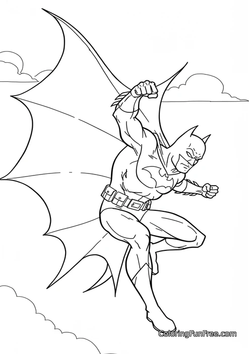 Batman leaps into action in this thrilling coloring page, soaring through the sky with his iconic cape spread wide behind him. With one fist raised high and the other clenched and ready, the Dark Knight looks fierce and determined. His pointed cowl, muscular build, and utility belt are clearly visible as he flies among the clouds. This dynamic pose captures all the excitement and power of Gotham City's greatest hero!
