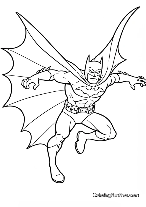 Batman soars through the air in this thrilling action pose, his iconic cape spread wide like giant bat wings! The Dark Knight looks powerful and determined as he leaps forward with arms outstretched and fists ready for action. His muscular build, pointed cowl with bat ears, and signature utility belt are all clearly visible. Kids will love bringing this legendary superhero to life with their favorite colors!