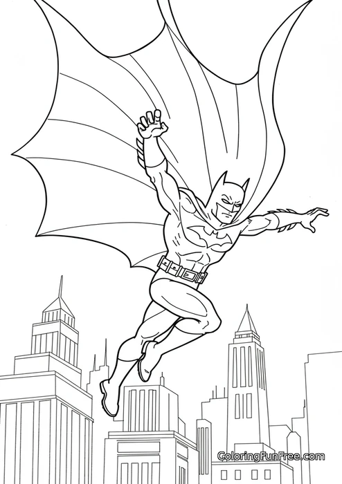 Use dark gray or black for Batman's suit and cape, with a yellow utility belt and bat symbol on his chest. The buildings below can be colored in shades of gray, blue, and brown, while the sky could be deep purple or dark blue to create a dramatic nighttime atmosphere. This page helps kids practice coloring detailed figures and architectural shapes while boosting creativity.