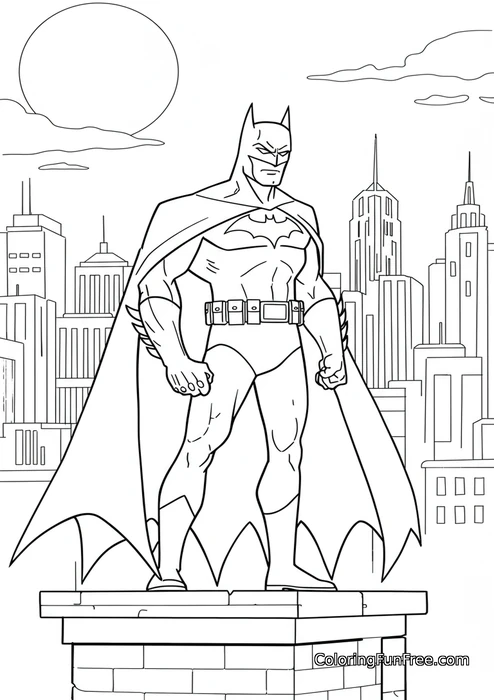 Use dark gray or black for Batman's suit and cape, with a yellow utility belt and bat symbol on his chest. Color the sky in deep blues and purples to create a nighttime atmosphere, and make the moon bright white or pale yellow. The buildings can be various shades of gray and blue. This detailed page helps kids develop fine motor skills while bringing their favorite superhero to life.