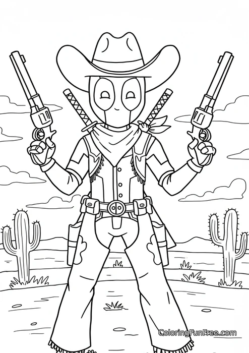 This fun coloring page features the beloved character Deadpool dressed up as a Wild West cowboy! He stands in a desert landscape complete with cacti and distant mountains, wearing a classic cowboy hat, bandana, fringed vest, chaps, and a big belt buckle. Two katana swords peek out from behind his back while he confidently holds two revolvers pointed toward the sky. His signature mask and expressive eyes give this adventurous scene a playful, humorous twist that kids will love.