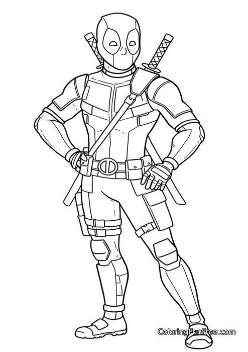 This exciting coloring page features the fun-loving superhero Deadpool striking a confident pose with his hands on his hips! He stands tall in his detailed tactical suit, complete with his signature mask featuring large expressive eyes. Two katana swords peek out from behind his back, crossed in their sheaths. His outfit includes a utility belt, leg straps, pouches, gloves, and sturdy boots, all packed with incredible detail that makes this page a thrilling adventure to color!