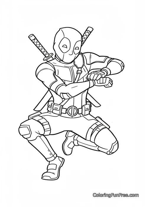 Get ready for action with this awesome Deadpool coloring page! The beloved Marvel antihero is striking a dynamic crouching pose, looking ready to spring into action at any moment. With his signature mask, tactical suit, belt with his iconic logo, and two katana swords strapped to his back, Deadpool looks incredibly cool. His muscular build and confident stance make this an exciting page that superhero fans will absolutely love to color!