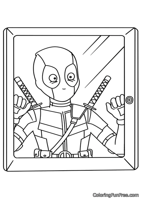 This fun coloring page features the beloved superhero Deadpool striking a playful pose inside a picture frame! He's waving cheerfully at you with one hand while showing off his iconic costume and two katana swords strapped to his back. With his expressive mask eyes and friendly gesture, this cartoon-style Deadpool looks ready to jump right out of his frame and join you for some coloring fun!