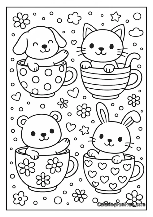 This adorable coloring page features four cute baby animals peeking out from decorative teacups! A happy puppy sits in a polka-dot cup, a smiling kitten rests in a striped cup, a friendly bear waves from a flower-patterned cup, and a sweet bunny snuggles inside a heart-covered cup. The background is filled with cheerful flowers, hearts, stars, clouds, and bubbles, creating a magical and joyful atmosphere that kids will absolutely love.