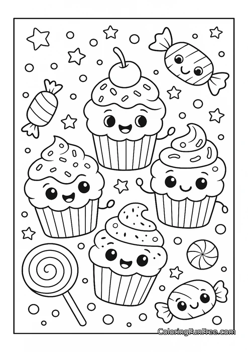 This adorable coloring page is bursting with sweet treats that will delight any young artist! Four cheerful kawaii cupcakes with big sparkling eyes and happy smiles take center stage, each topped with swirly frosting, sprinkles, and a cherry. Surrounding them are wrapped candies, a swirl lollipop, a peppermint, and playful stars and bubbles scattered throughout the background, creating a magical candy wonderland full of joy and sugary fun.
