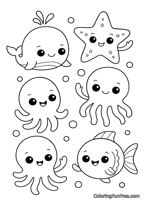 Dive into an adorable underwater world filled with six cute sea creatures! This delightful coloring page features a cheerful whale spouting water, a smiling starfish, a playful octopus waving its tentacles, a happy jellyfish, another friendly octopus, and a sweet little fish. Tiny bubbles float all around them, creating a bubbly ocean atmosphere. Each creature has big kawaii-style eyes and warm smiles that make this page absolutely charming for young artists.