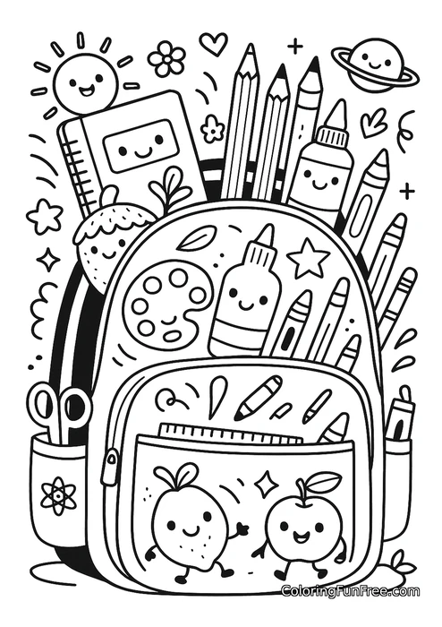 This adorable coloring page features a cheerful school backpack bursting with kawaii-style supplies! Smiling pencils, crayons, a notebook, a paint palette, glue bottle, and scissors peek out from the bag. A happy sun, a cute planet with rings, and tiny stars surround the scene. In the front pocket, a friendly lemon and apple wave hello beside a ruler. Every item has an adorable face, making back-to-school feel exciting and fun!