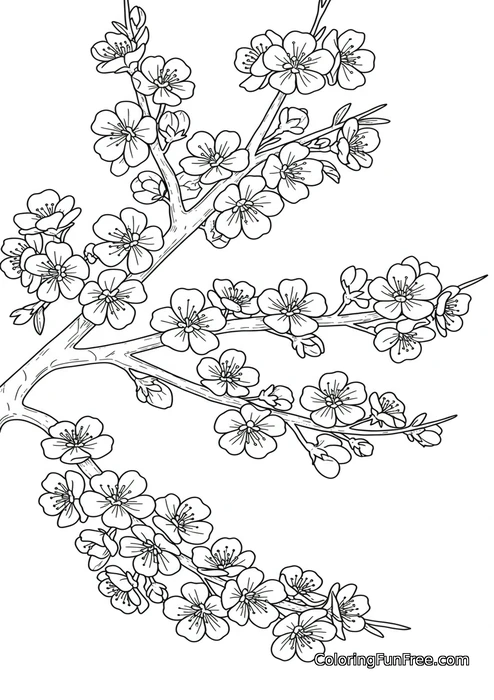 This beautiful coloring page features graceful cherry blossom branches bursting with dozens of delicate flowers! A sturdy tree branch stretches across the page, splitting into smaller twigs that are covered in lovely five-petaled blooms. Each flower shows detailed stamens in the center, creating a stunning springtime scene. The branches cascade from the upper left corner down to the lower right, creating a peaceful and elegant composition that captures the magic of spring in full bloom.