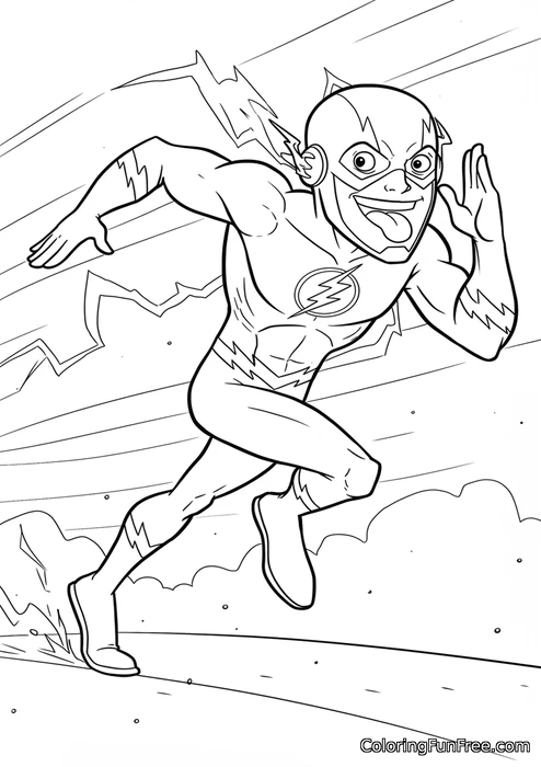 The Flash is bursting into action in this thrilling coloring page! The iconic DC superhero is shown mid-sprint, racing at incredible speed with a huge, excited grin on his face. Lightning bolts crackle behind him as speed lines streak across the background, showing just how fast he's moving. His famous lightning bolt emblem shines proudly on his chest, while his winged ear pieces flutter in the wind. Dust and debris kick up beneath his boots as he zooms forward.