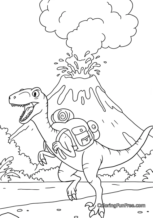 This exciting coloring page features a friendly raptor dinosaur wearing a backpack, ready for an amazing prehistoric adventure! The energetic dino is walking along a path surrounded by lush vegetation while a dramatic volcano erupts in the background, sending lava splashing and thick clouds of smoke billowing into the sky. With its sharp teeth showing in a cheerful grin, this adventurous raptor looks like the coolest explorer of the Jurassic era!