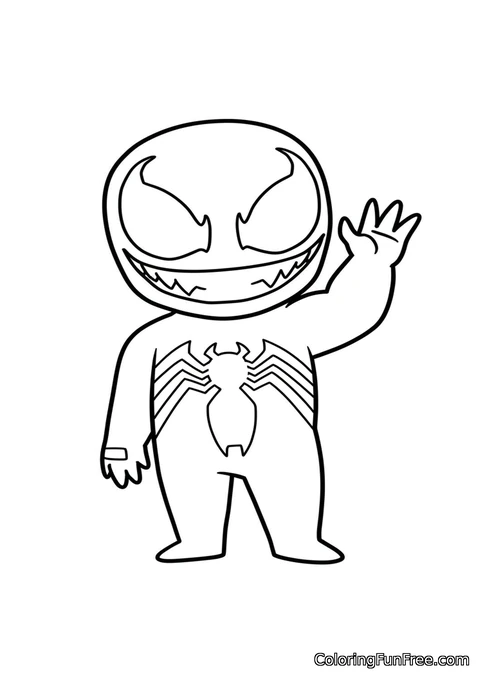 Meet this adorable chibi version of Venom, the famous Marvel character, standing and waving hello with one hand raised! With his oversized round head, menacing curved eyes, and wide toothy grin, this tiny Venom looks more cute than scary. His chest features the iconic spider symbol that fans will instantly recognize. This playful, cartoonish design transforms the fearsome symbiote into a friendly little buddy that kids will love coloring.