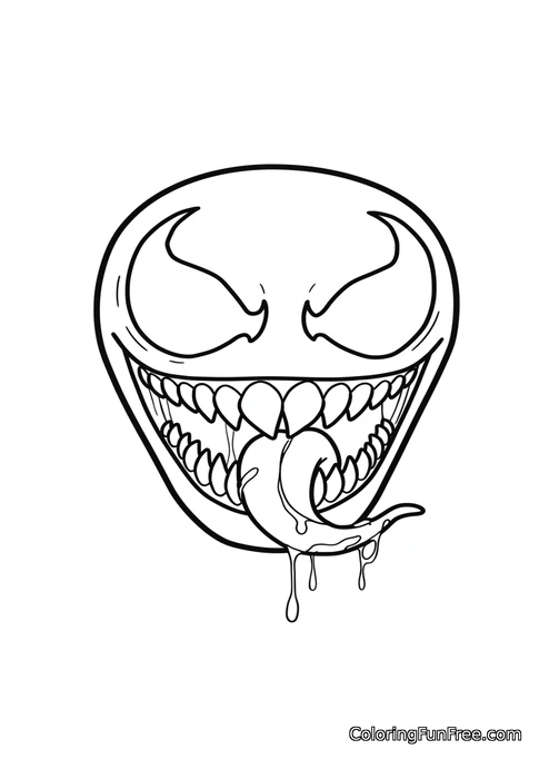 Get ready to meet one of Marvel's most iconic anti-heroes! This coloring page features a dramatic close-up of Venom's terrifying face, complete with his signature menacing grin full of sharp, jagged teeth. His large, angular eyes give him a fierce expression, while his long, dripping tongue curls out of his massive mouth. Drool and slime drip from his jaw, adding to his wild and spooky appearance. Kids who love superheroes and villains will have a blast with this one!